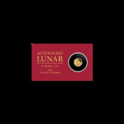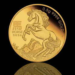 Инвестиционна златна монета с тегло 0.5 грама и най-висока чистота 999.9/1000, част от световноизвестната „Австралийска лунарна серия III“ на монетния двор Perth Mint. Емисията за 2026 г. е посветена на Годината на Коня – седмият знак от китайския зодиак, символ на свобода, скорост и решителност. Въпреки компактния си размер, монетата се отличава с невероятна детайлност на изображението и е перфектен избор за символичен подарък за късмет или за стартиране на златна колекция.