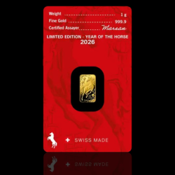 Инвестиционно златно кюлче от серията „Лунар“ (Lunar Series) с тегло 1 грам и чистота 999,9/1000, произведено от елитната швейцарска рафинерия Argor-Heraeus. Изданието за 2026 година е посветено на Годината на Коня – символ на динамика, просперитет и свободен дух. Въпреки компактния си размер, кюлчето притежава всички характеристики на по-големите инвестиционни единици, съчетавайки достъпност с безкомпромисно швейцарско качество.