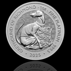 1 унция платинена монета „Зверовете на Тюдорите – Хрътката от Ричмънд“ 2025 е седмото издание от престижната колекция на Royal Mint, вдъхновена от десетте каменни кралски зверове, пазещи входа на двореца Хамптън Корт. Тези величествени фигури символизират легитимността и съюзите на Хенри VIII и Джейн Сиймур, а хрътката от Ричмънд е един от най-емблематичните символи, наследени от династията Ланкастър.