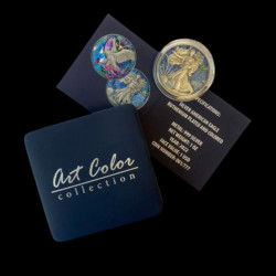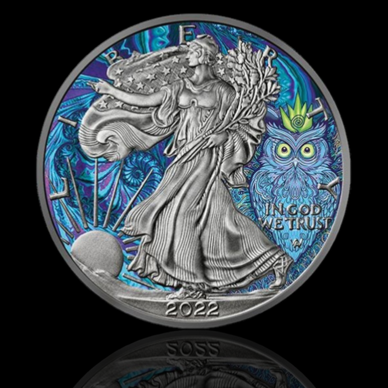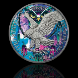 Инвестиционна сребърна монета Американски орел (American Eagle) с тегло 1 унция и чистота 999/1000, част от лимитираната колекция "Art Color – Духовни животни". Това специално издание е посветено на Бухала – древен символ на познанието, проницателността и тихата сила. Дизайнът съчетава класическия американски нумизматичен шедьовър с модерен, художествен финиш, превръщайки всяка монета в уникален талисман. Използваната технология за цветно нанасяне подчертава мистичния характер на бухала, правейки детайлите на релефа да оживяват. Лимитирана серия от 777 броя.