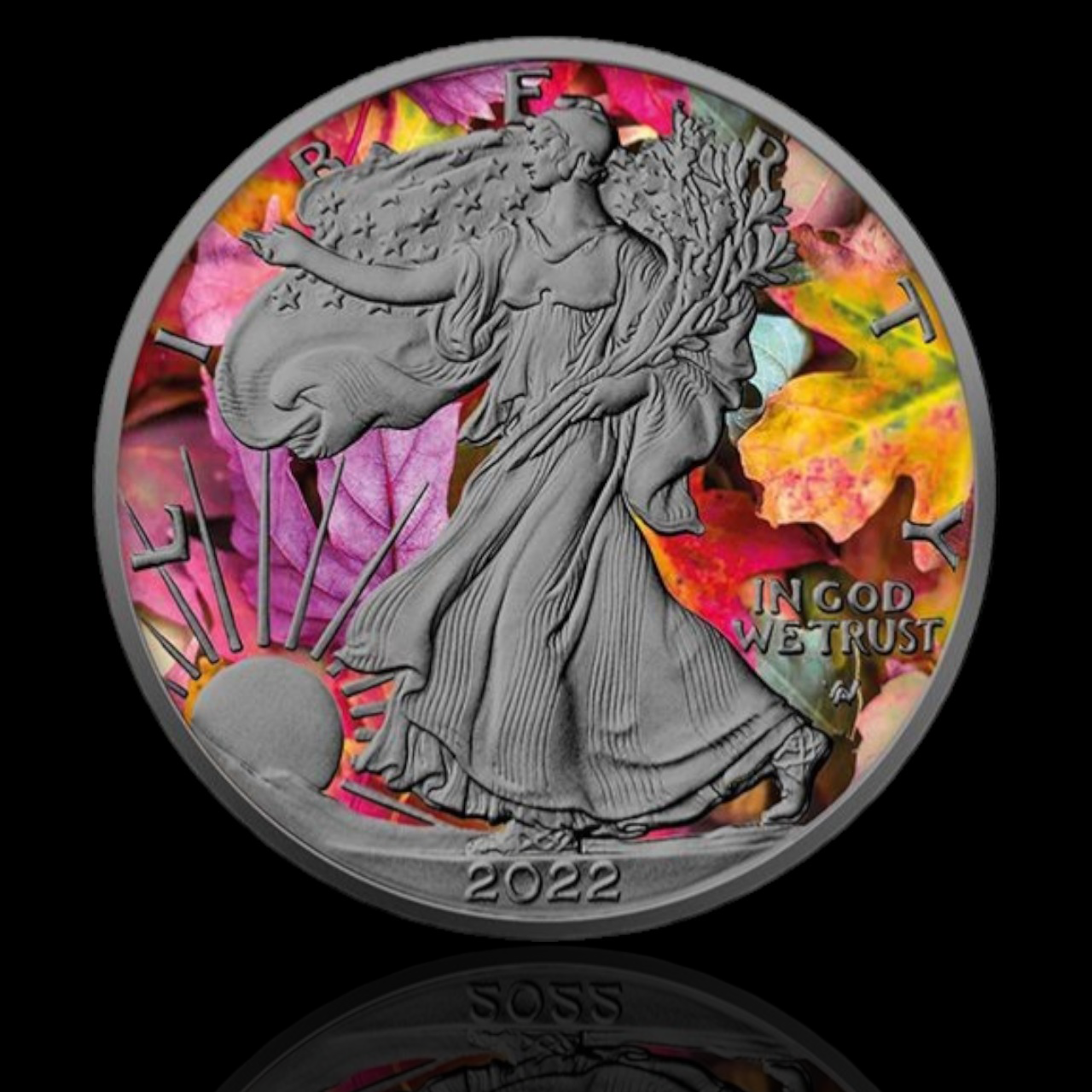 Лицева страна: Показва вечната фигура на „Крачещата свобода“ (Walking Liberty), заобиколена от палитрата на есента. Дизайнът включва детайлно изобразени есенни листа и меки цветови преливания, които придават дълбочина на композицията. Традиционните надписи "LIBERTY", "IN GOD WE TRUST" и годината на емисия са запазени като част от автентичния облик.