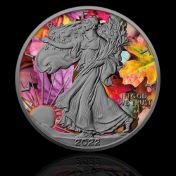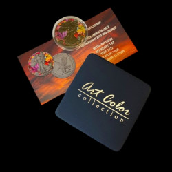 Инвестиционна сребърна монета Американски орел (American Eagle) с тегло 1 унция и чистота 999/1000, част от цветната колекция "Art Color – Четирите годишни времена". Това специално издание е посветено на Есента – сезонът на зрелостта, изобилието и златните нюанси. Дизайнът пренася класическия американски орел в една магична есенна атмосфера, използвайки прецизна технология за цветно нанасяне. Топлите оранжеви, червени и кафяви тонове подчертават детайлите на релефа, превръщайки монетата в истинско произведение на изкуството с висока нумизматична стойност. Лимитирана серия от 1000 броя.