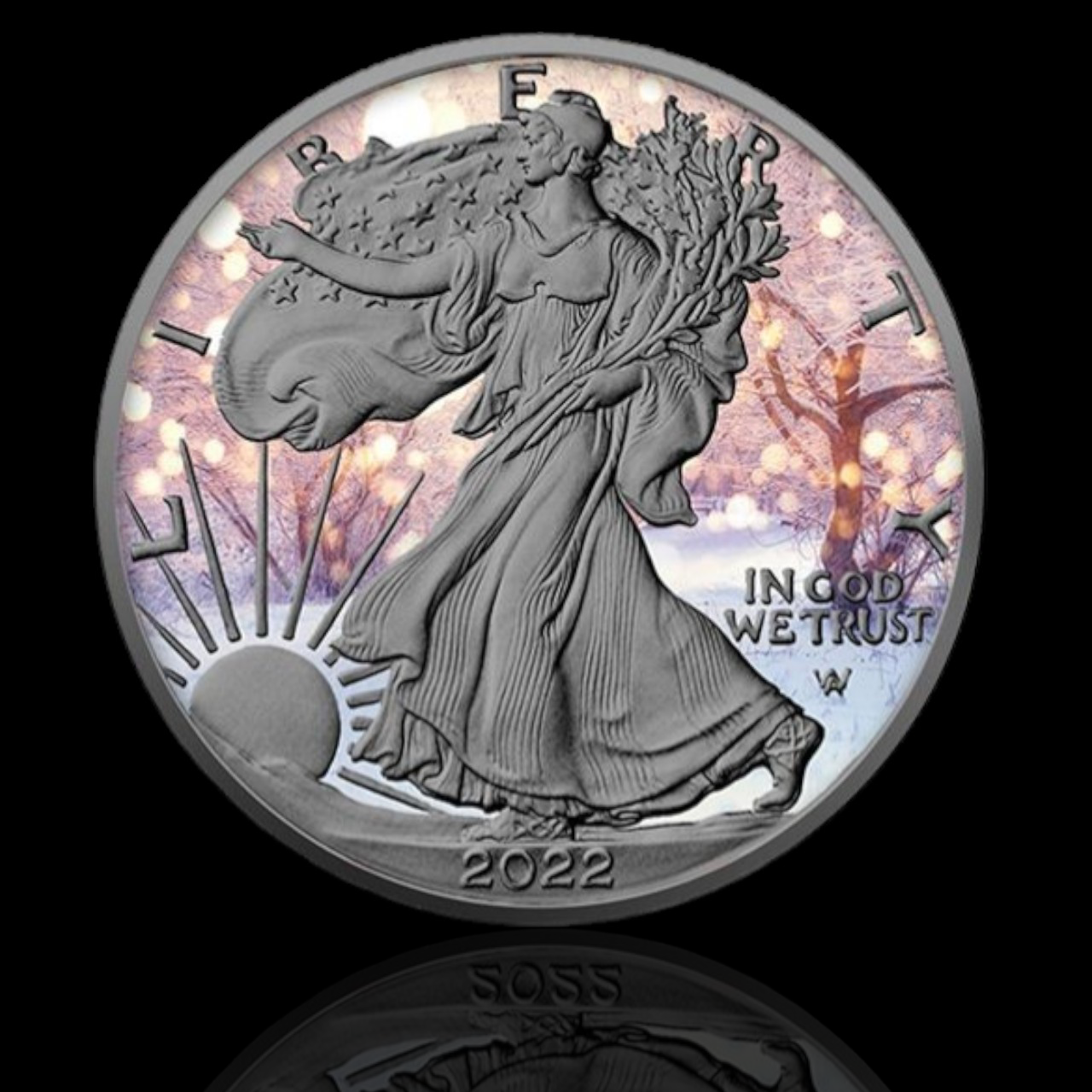 Инвестиционна сребърна монета Американски орел (American Eagle) с тегло 1 унция и чистота 999/1000, част от цветната колекция "Art Color – Четирите годишни времена". Това специално издание е посветено на Зимата – сезонът на тишината, кристалната чистота и ледената магия. Класическата фигура на американската нумизматика е преобразена чрез иновативна технология за цветно нанасяне, която добавя детайлни снежни мотиви и ледени акценти в синята гама. Монетата съчетава тежестта на благородния метал с изяществото на зимния пейзаж, превръщайки се в задължителен елемент за всяка сериозна колекция. Лимитирана серия от 1000 броя.