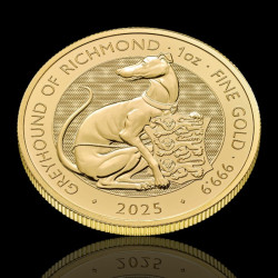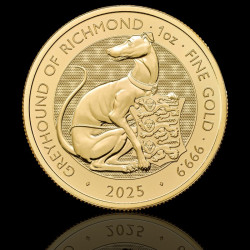 1 унция златна монета „Зверовете на Тюдорите – Хрътката от Ричмънд“ 2025 е седмото издание от престижната колекция на Royal Mint, вдъхновена от каменните кралски зверове, пазещи входа на двореца Хамптън Корт. Хрътката от Ричмънд е символ, наследен от Хенри VIII от династията Ланкастър, и олицетворява вярност, смелост и благородство.