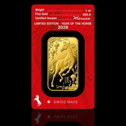Инвестиционно златно кюлче от серията „Лунар“ (Lunar Series) с тегло 1 унция и чистота 999,9/1000, произведено от престижната швейцарска рафинерия Argor-Heraeus. Изданието за 2026 година е посветено на Годината на Коня – символ на енергия, независимост и триумф. Кюлчето съчетава най-високо качество на изработка с художествена стойност, което го прави изключително ценно както за инвеститори, така и за колекционери. С лимитиран тираж от едва 18 888 броя. Със стандартно тегло от 1 унция (31,1035 грама), то е лесно за търговия и съхранение в международен мащаб.