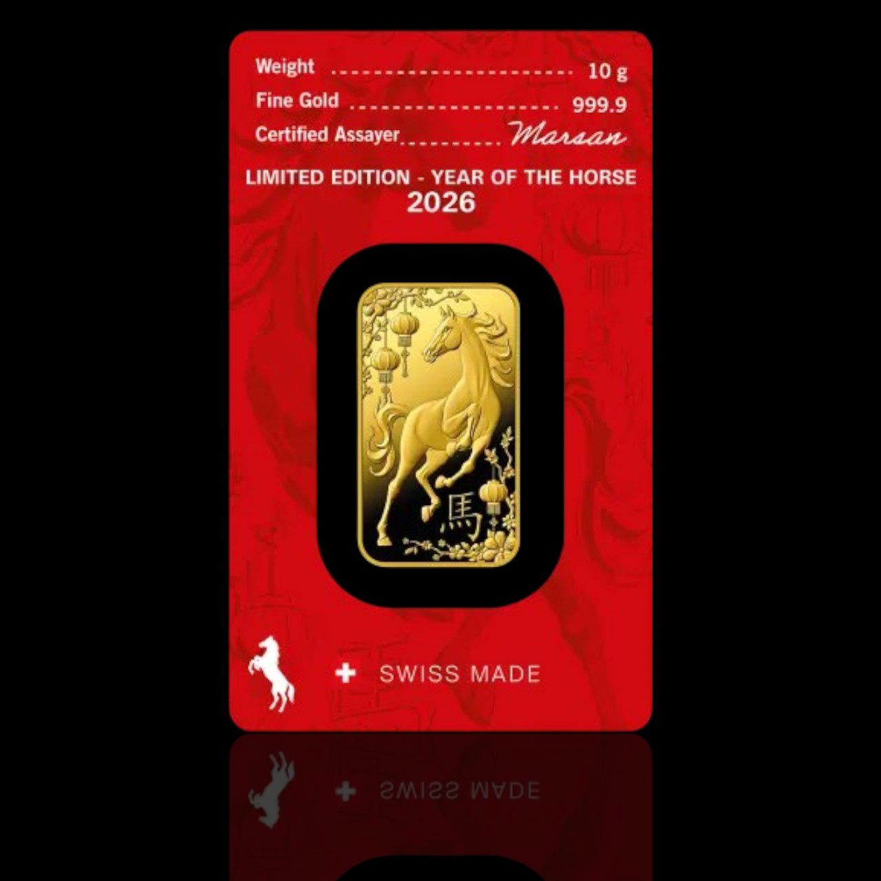 Инвестиционно златно кюлче от серията „Лунар“ (Lunar Series) с тегло 10 грама и най-висока чистота 999,9/1000, произведено от водещата швейцарска рафинерия Argor-Heraeus. Изданието за 2026 година е посветено на Годината на Коня според китайския лунен календар. Този компактен грамаж е изключително популярен, тъй като предлага отличен баланс между достъпна цена и висока ликвидност. Дизайнът съчетава традиционна символика с модерна прецизност, правейки кюлчето идеално за добавяне към всеки инвестиционен портфейл. С лимитиран тираж от 18 888 броя.