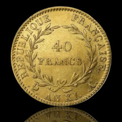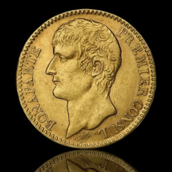 Изключително ценна историческа златна монета с номинал 40 франка, отсечена по време на управлението на Наполеон Бонапарт като Първи консул (Premier Consul). Емисиите от годините AN XI и AN 12 (1802–1803 г. по Революционния календар) бележат началото на модерната френска парична система. Монетата е символ на възхода на Наполеон и консолидацията на властта му във Франция, като се отличава с внушително тегло и класически дизайн, характерен за епохата на Консулството.
