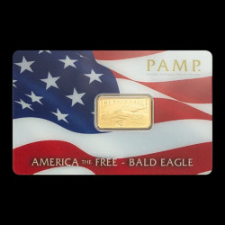 Инвестиционно златно кюлче от 5 грама, произведено от елитната швейцарска рафинерия PAMP (Produits Artistiques Métaux Précieux). Дизайнът е част от серията, посветена на американските национални символи, и изобразява величествения Белоглав орел. Кюлчето е отсечено от най-висока проба чисто злато (.9999) и съчетава в себе си сигурността на швейцарското банково злато с изключителна художествена стойност. Доставя се в оригинална сертификационна опаковка (CertiPAMP™), която служи едновременно за защита и гаранция за автентичност.