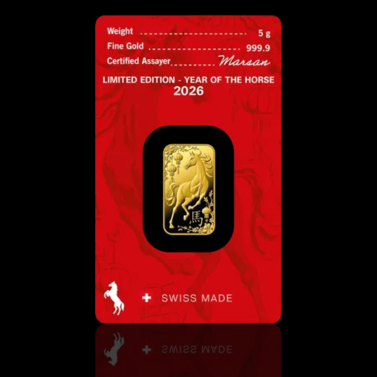 Инвестиционно златно кюлче от серията „Лунар“ (Lunar Series) с тегло 5 грама и чистота 999,9/1000, прецизно изработено от световноизвестната швейцарска рафинерия Argor-Heraeus. Емисията за 2026 година е посветена на Годината на Коня – символ на енергия, успех и прогрес. Със своята компактна форма и гарантирано швейцарско качество, това кюлче е един от най-търсените продукти за подарък и диверсификация на активите в злато.