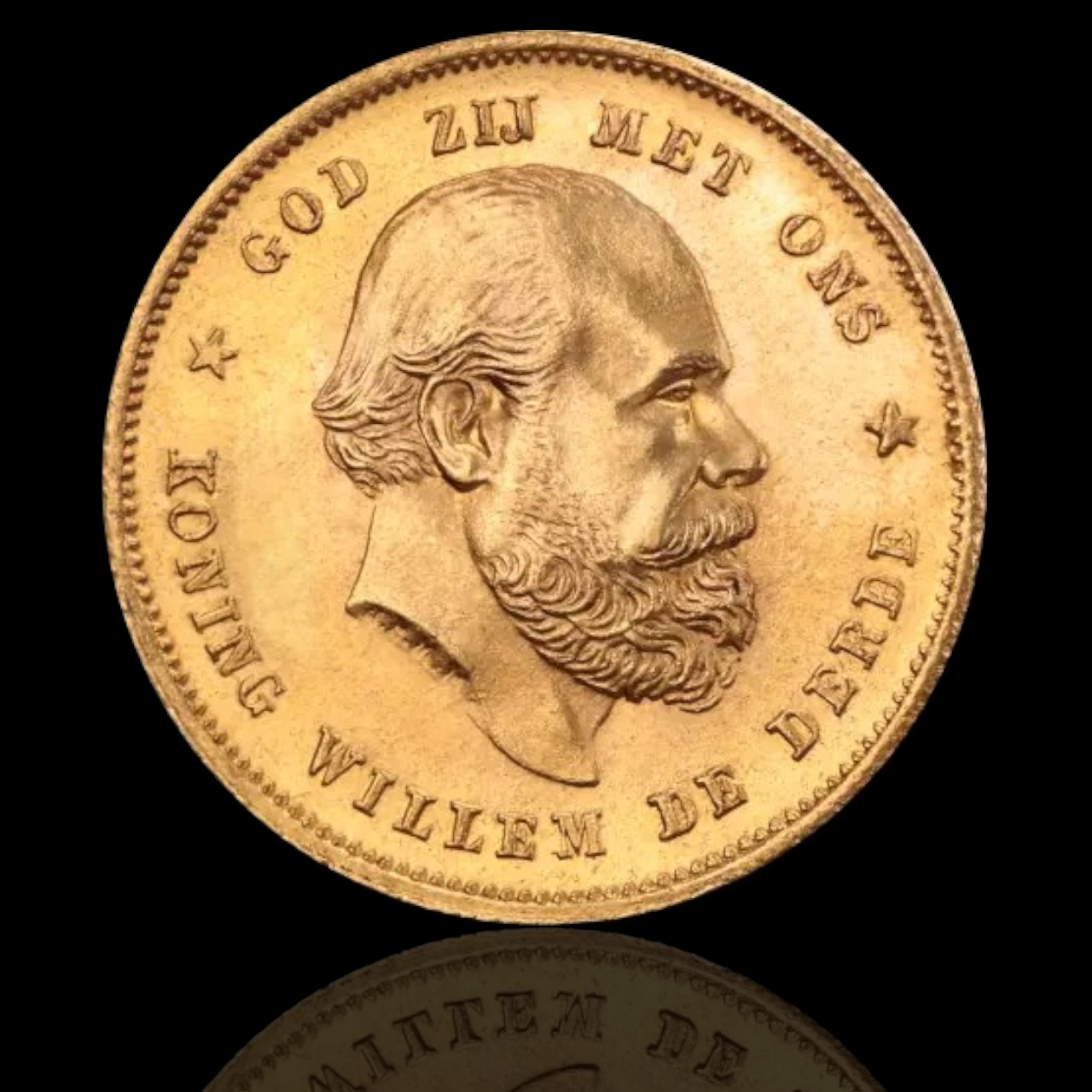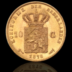 Златна инвестиционна монета от 10 Холандски Гулдена (10 Dutch Guilders), отсечена в периода 1875–1889 г. под управлението на крал Вилхелм III (Willem III). Тази историческа монета е един от най-разпознаваемите символи на Нидерландското кралство и е високо ценена от инвеститори и колекционери заради своята чистота, богато минало и международна разпознаваемост. Със своята 21.6-каратова сплав, тя е устойчива на износване, което я прави идеален актив за физическо съхранение на стойност.
