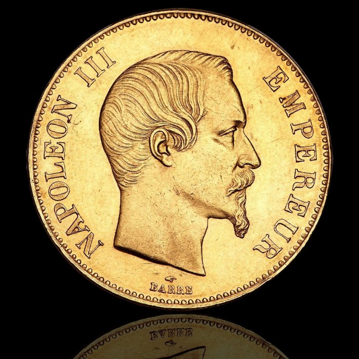 Златната монета от 100 френски франка на Наполеон III, изсечена между 1855 и 1859 година, е впечатляваща както със своето съдържание на злато, така и с нейния красив и символичен дизайн. Тя тежи 32.258 грама и съдържа 90% злато. Монетата е с голяма историческа стойност и е важен артефакт от времето на Втората Французка империя, управлявана от Наполеон III.