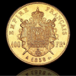 На реверса на монетата е изобразен гербът на Втората империя на Франция, който символизира властта и могъществото на империята. Той включва различни елементи, свързани с френската корона и императорската власт. Над герба е изписан текстът: "EMPIRE FRANÇAIS" (Френска Империя) и "100 FRs" (100 франка), обозначаващи номинала на монетата. Под герба е годината на емисия — 1858.