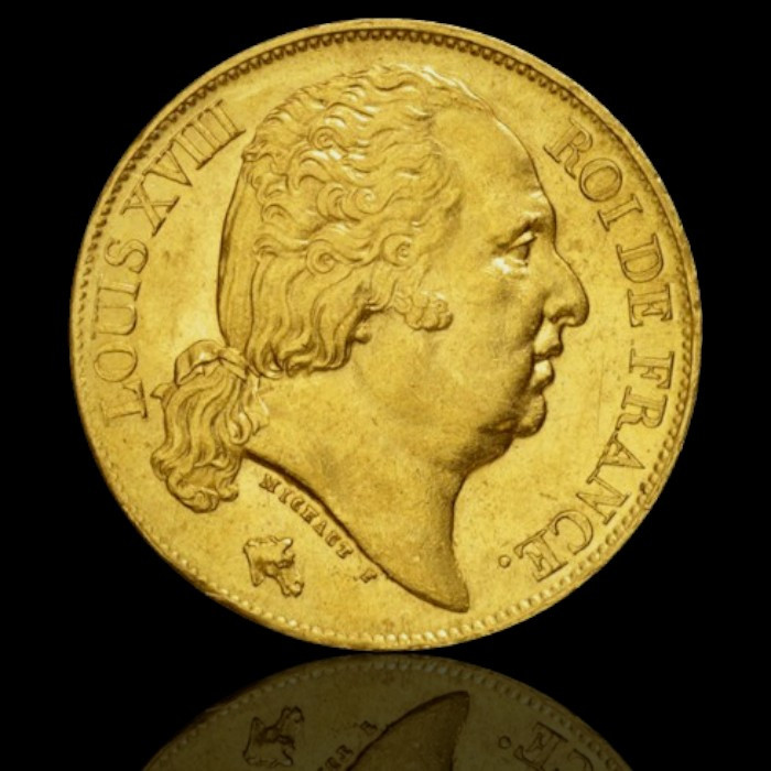 Златна Монета 20 Френски Франка Луи XVIII (1816–1824) е ценен нумизматичен екземпляр, сечен във Франция по времето на реставрацията на монархията. Произведена е в монетния двор Monnaie de Paris, с тегло 6,45 грама и проба 900/1000, което означава, че съдържа 5,81 грама чисто злато. Монетата има диаметър 21 мм, дебелина 1,25 мм и назъбен ръб.