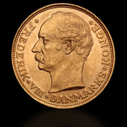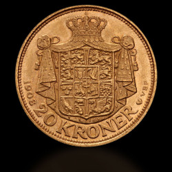 Кралският датски монетен двор произвежда златната монета от 20 крони Фредерик VIII между 1908 и 1912 г. Основната парична единица на датското кралство, златната монета крони, е въведена за първи път през 1874 г., една година след като Дания изоставя сребърния стандарт. Тази златна монета, която е на стойност 21,6 карата и има чистота 90,00%, е изсечена по време на управлението на датския крал Фредерик VIII. Тя тежи 8,06 грама или 0,2592 тройунции, диаметърът на тази златна монета е 23 мм.